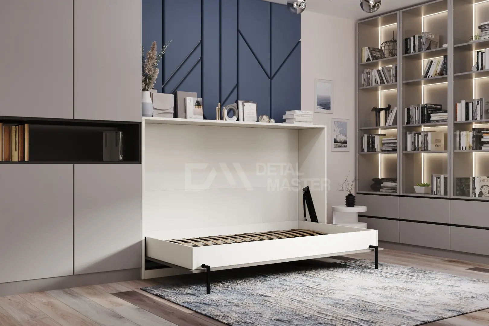 Горизонтальная шкаф-кровать "Solo Start".  Работает на механизме раскладывания собственной разработки "Start". Кровать раскладывается легким движением руки, превращаясь в полноценное спальное место. Просто потяните ее за ручки, расположенные на фасаде и выставите ножки-опоры.